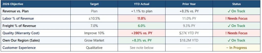 We came out of the gate strong. Revenue is ahead of plan and up over 8% versus last year. That matters. But as I’ve said before, 2026 will be won on consistency, not early wins. The scorecard below tells the full story-and there are areas that need our honest attention.